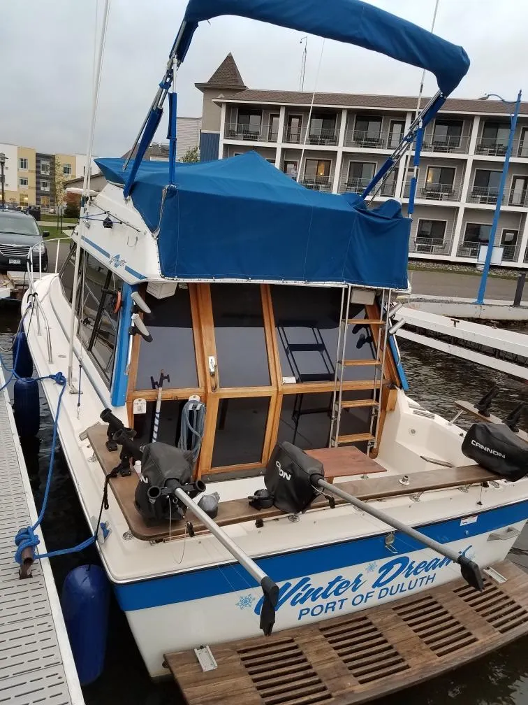 1980 Bayliner 3250 Conquest Command Bridge with 360 views on main deck. Great boat for fishing, anchoring and living. Vessel boasts two staterooms.