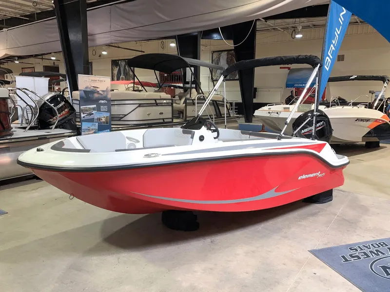 This 2024 Bayliner Element M15 deck boat is powered by a Mercury 50. It's a spacious 15-footer with comfortable seating and storage throughout. Standard features include a swimming ladder, 12-gallon fuel tank, and a 12V charging port.