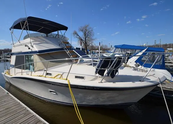 1975 Bayliner Montego 3350, twin 270 hp Crusader, GM 350 CID, 5.7l, raw water cooling, 600 approximate hours, starboard engine rebuilt 2019, I/O's, Onan 5.0 kw diesel generator with separate diesel fuel tank, NHM, dual station, 30 amp/115vac electrical service, shore power cord, three batteries, Pro Mariner battery charger, water heater, pressure water, King Air reverse cycle air/head, Raritan electric head, stall shower and vanity, sleeps five, master stateroom forward with V-berth, guest stateroom forward with bunk berths, blue carpet, double stainless steel sink, Norcold 12vdc/115vac refrigerator/freezer, Kenyon two burner propane stove, Sharp microwave oven, sofa salon, Vizio flat panel TV, Polaris VHF marine radio, VHF antenna, Datamarine depth finder, blue canvas, bridge and cockpit bimini tops, windshield privacy cover, anchor, four fenders with fender racks, mooring lines, Ritchie compass, electric horn and BBQ grill, remote control spotlight, teak swim platform with boarding ladder, Leveller trim tabs.