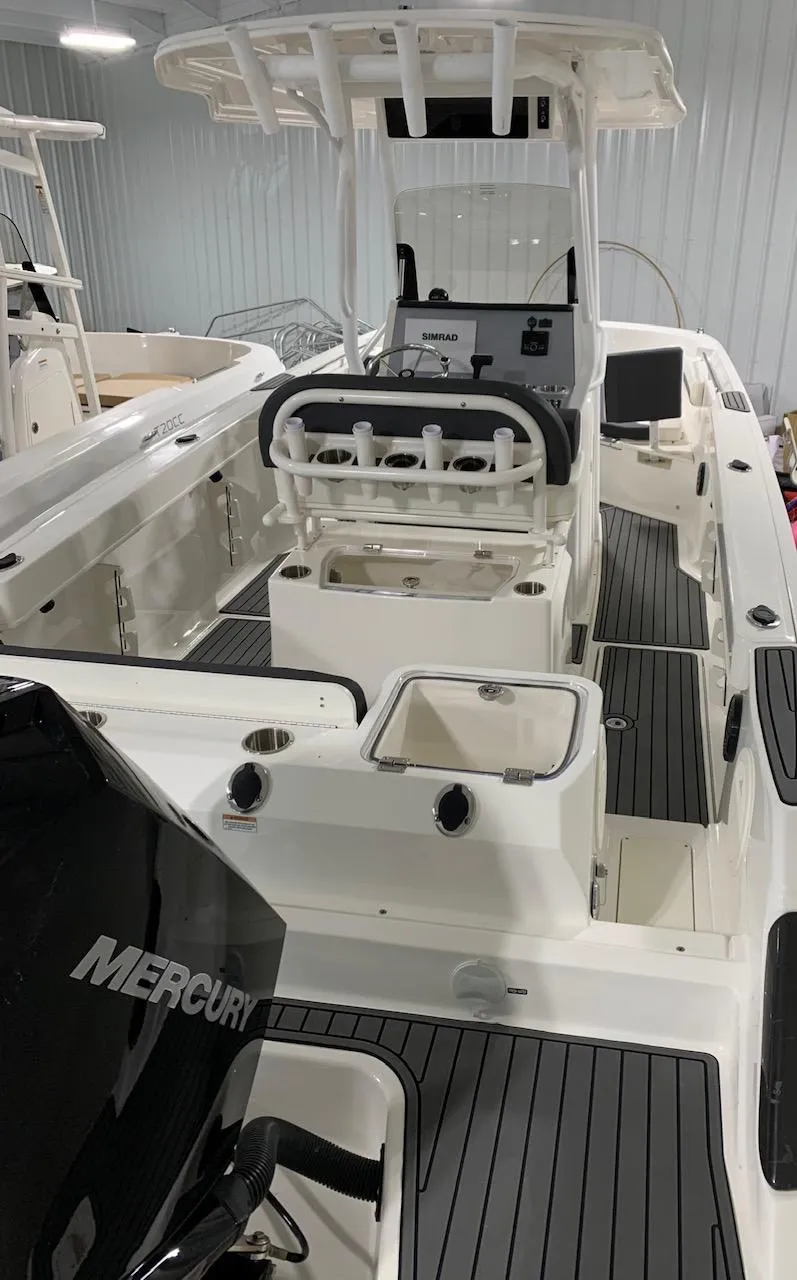 This 2024 Bayliner Trophy 24 center console is powered by a Mercury 250. It's the newest addition to the Trophy series and it comes loaded with features including increased fishability, storage space, and comfortable seating for the whole family. Built on a deep-V hull foundation, the T24 CC accommodates up to 12 people, making it a great family fishing boat for inshore or coastal angling.