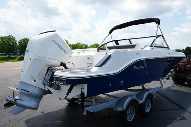 All new Bayliner T22SC side console powered by Mercury 250XL. Includes power steering, Bimini Package with bimini top, stainless steel upgrade, pop up cleats, dual batteries with switch, windshield wiper, Comfort Package with portable head, transom shower, Demand water system, cockpit table, bow filler cushion, Tech Package with Rockford Fosgate stereo, Vessel View mobile, Exterior Lighting Package, Interior Lighting Package, ski tow pylon, bow and cockpit covers, graphite interior, gray mat cockpit flooring, digital dash with Merc Vesselview link, trim tabs, trolling motor plug, Galvanized Karavan trailer and more.