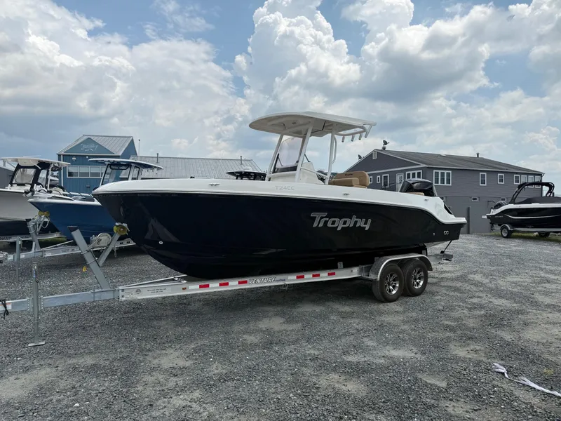 2024 Bayliner Trophy T24CC, upgrade to Mercury 250 4-stroke, non-DTS, Power Assist Steering, (add $6,746 for new aluminum trailer), Solid Black hull, Coastline Tan Interior, Trophy Upgraded Decal, Stainless Steel Package, Hard Top upgrade, Bow Filler Cushion, Premium Helm Seat w/ Flip Up Bolsters, CC Fishing Seat w/ Livewell, Portable Head, Cockpit Flooring Teak Mat, Fresh Water Transom Shower, 9" Simrad Digital Dash, Rockford Fosgate Stereo Upgrade, Premium Steering Wheel w/ Knob