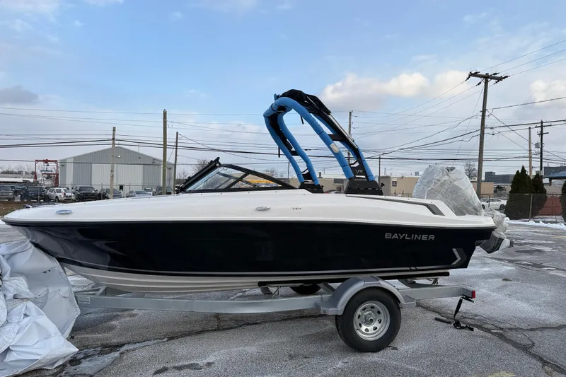 This 2026 Bayliner VR4 Outboard is a sleek, versatile bowrider built for family fun, cruising, and watersports, finished in striking black hull sides with a white bottom for a clean, modern look. Powered by a reliable and fuel-efficient Mercury 115HP FourStroke EFI outboard, it delivers smooth performance with easy ownership. The spacious cockpit features the VR Series Graphite interior with comfortable high-back seating, smart storage throughout, and a supportive helm bucket seat paired with an intuitive dash layout. An opening windshield with center walk-through and side wings allows easy movement forward, while a Rockford Fosgate stereo system and digital depth indicator enhance entertainment and confidence on the water. Equipped with a ProArc tower with integrated bimini top, this VR4 is ideal for watersports and provides welcome shade when relaxing, and it also includes a bow well and full cockpit cover for added convenience and protection. The package is completed with a galvanized single-axle trailer with swing tongue and brakes, making towing and storage simple, resulting in a turnkey bowrider that blends performance, comfort, and style for enjoyable days on the water.