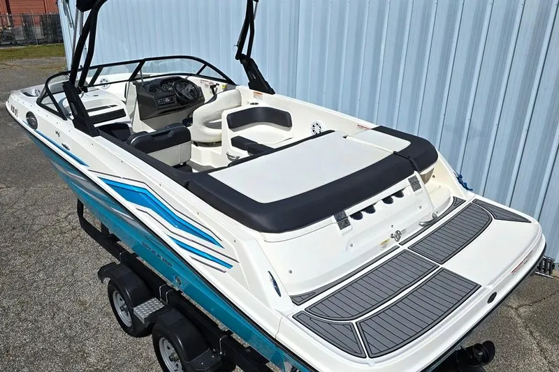 2019 Bayliner VR6 BR (22'4" X 8'), '19 MerCruiser 4.5L 250 HP EC A2, '19 Karavan tandem axle bunk Trailer with fold away tongue, LED lights & 4 wheel disc brakes. This boat is Baby Blue & White with Gray & Black graphics. The cockpit floorplan has a single drivers bucket seat with flip up thigh rise bolster With an aft facing seat right behind it. The port side has a versatile L-Lounge with flip up backrest that Makes a forward facing passengers seat. The L-Lounge wraps all the way around and across tot the stbd Side walk thru transom passage. The aft sunpad is full width with a flip up cushion to form the walk thru Passage or prop up to form a chaise sunlounge. There are even filler cushions for the walk thru passage To make it into a U-Shaped aft seat. Helm features include tilt wheel, full instrumentation pkg. with power Trim gauge and in dash digital depthfinder, lighted toggle switches, Jensen AM/FM/Bluetooth/USB and AUX IN Stereo, 12V rec. and 4 JL Audio Co-axial speakers. The port side console has a glove box and a Large privacy enclosure/storage compartment/bathroom if you add a potti (Doesn't have one now). Cockpit Features include a full fiberglass cockpit liner with snap down vinyl flooring, SST cupholders, under floor Ski/wakeboard storage and fire extinguisher. Other features include a wakeboard/watersports tower with Integral Bimini shade top, bow filler cushion, full width FBG swim platform with 4 step telescoping SST Swim Ladder, SST ski tow eye, battery On/Off switch and snap down cockpit and bow covers for storage. This boat is in average condition cosmetically but only has 102 engine hours use (17 hours per season average) Note: 1) SeaDek swim platform flooring is coming off.