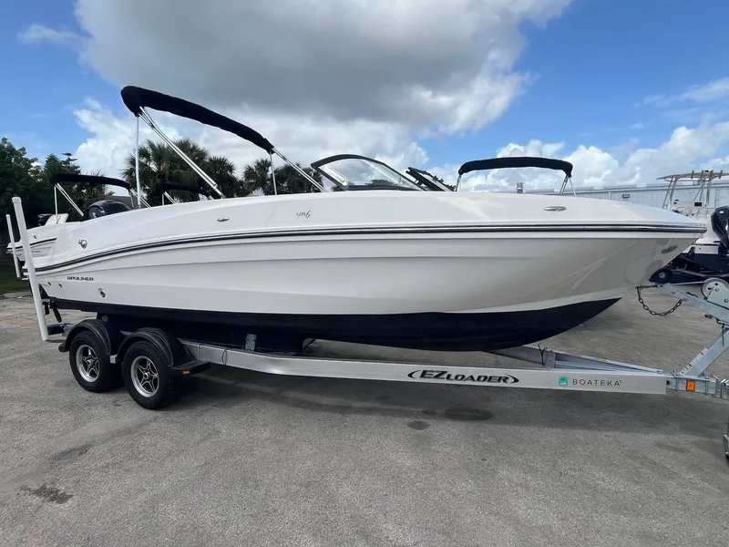 A larger version of our VR5, the VR6 is also all about space and unparalleled roominess. It combines Bayliner's category-leading BeamForward™ design and AftAdvantage™ concept-which increases the self-draining cockpit's seating area by adding the swim platform at the end of the running surface. This boat maximizes space and value like never before-regardless of whether you choose outboard or sterndrive power. You'll also find pleasant surprises like a lockable enclosed changing room (head optional), and aft-facing companion/observer seat that's ideal for water sports and-with the addition of a filler cushion-creates a comfortable U-lounge that turns the whole aft section into an inviting gathering area.