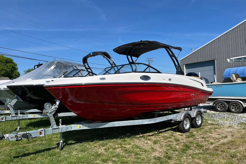 2026 Bayliner VR6 Outboard, Mercury 150hp EFI 4-Stroke Outboard, Galvanized Trailer w/brakes and Swing Tongue, Solid Rally Red Hull and Bottom, Coastline Tan Interior, Simrad 7" Digital Dash w/ Engine Data, Pro-Arc Tower w/ Integrated Top, Wireless Phone Charger, Rockford Fosgate Stereo, Bow Filler Cushion, Windshield w/Opening Center and Side Wings, Interior Lighting Package, Stainless Steel Upgrade Package, Bow Well and Cockpit Cover, Ski Tow Pylon