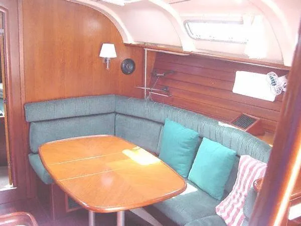 Spacious interior with a large "U"shaped settee with lowering table for making into another berth on the Starboard side with a double settee on the port side in front of the galley. This is a single head/shower version and rather than 2 modest aft berths she has one Very Large aft berth with entrance on the portside just aft of the galley. The built-in double Air Conditioning/heat certainly is a delight. The comfort of this 381 Beneteau is tremendous.