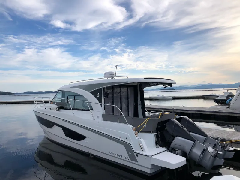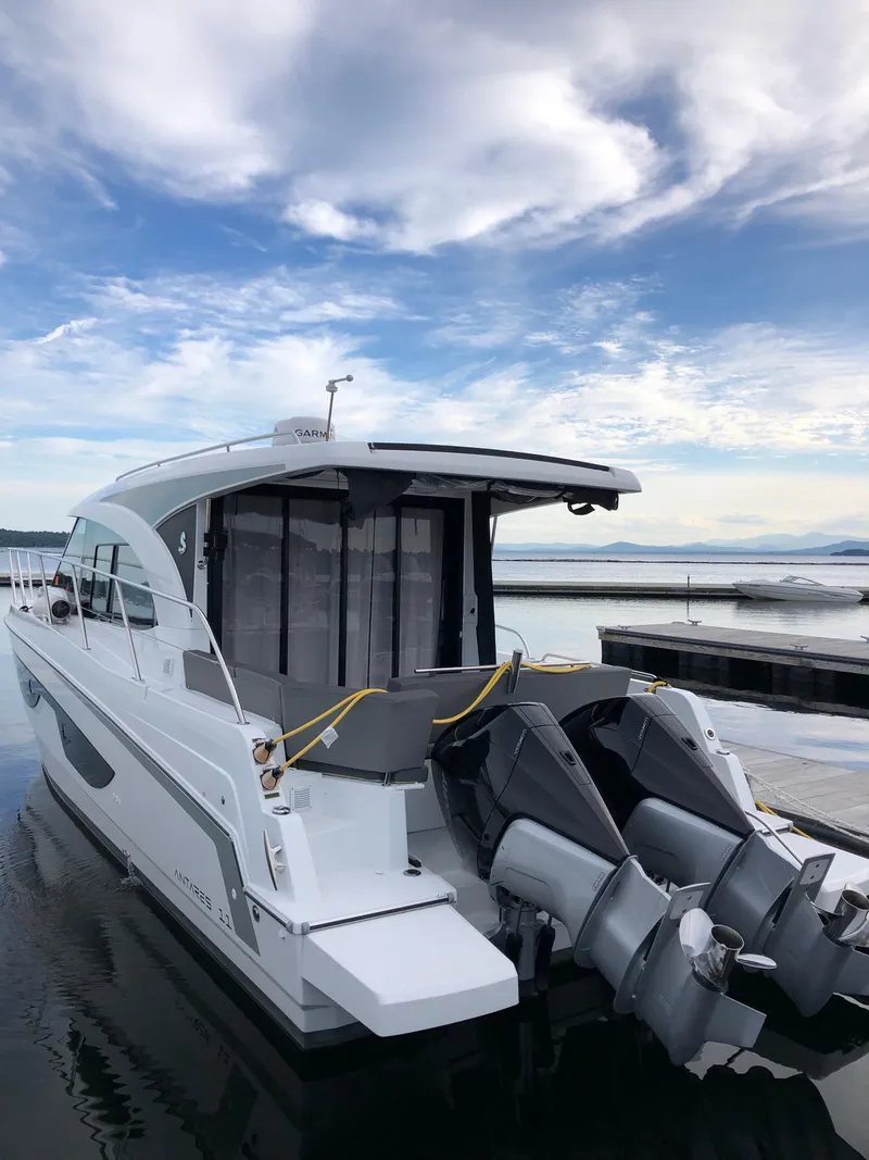 The result of a collaboration between BENETEAU and Sarrazin Design, the Antares 11 is setting the standard for what a pocket cruiser can be. Ample natural light, tons of seating, fold down swim platform and a forward sunpad are just a few of the features of the boat. Natural light and cruising comfort characterize this large weekender. The double master cabin with en-suite shower room is well above the usual standards. The full beam aft cabin has room for three. In the salon, the Antares 11 can easily entertain up to 7, while you enjoy the stunning views through ample windows. The Antares 11 is designed to help you do it all. Pushed by twin Mercury 300s, you will have the power and comfort to go almost anywhere.