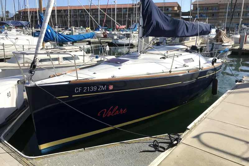 "Volare": a beautiful dark blue hull, clean and comfortable day-sailer/racer/ weekend cruiser, docked at Ventura Marina, CA. Ready to go!