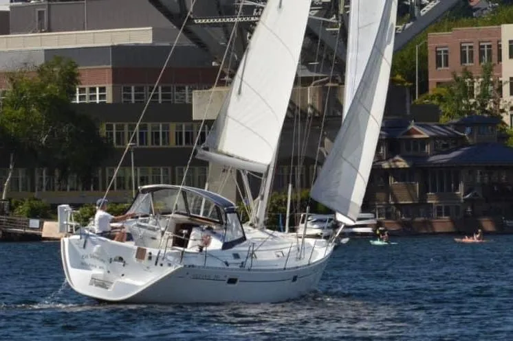With approximately 586 square feet of sail area and a moderate displacement profile, the 381 is not designed to win regattas - it is designed to take you places comfortably.