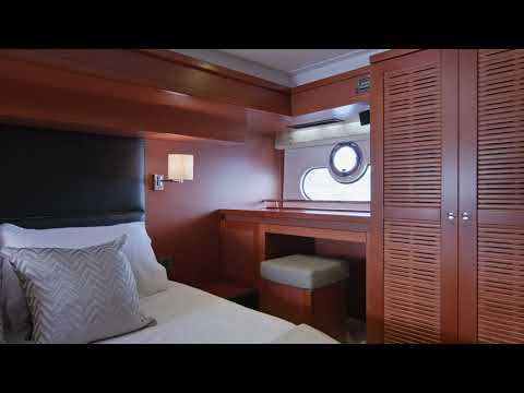 The shape of the underbody, along with bowthruster, sternthruster and trim tabs make this vessel stable, maneuverable and comfortable. Flybridge and interior helm stations make for comfortable cruising in all weather and the asymmetrical deck layout, with open side deck to port and covered side deck to starboard with high bulwarks and solid stainless steel life guards, for safe passage from cockpit to bow.