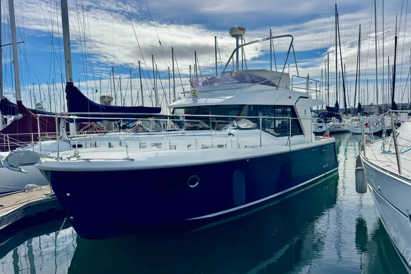 The bright salon, well-equipped galley, private cabin, and separate shower provide true liveaboard comfort, while the flybridge with upper helm and seating offers the perfect command station underway or a relaxing space at anchor. Bow and stern thrusters make docking simple for couples or solo operators.