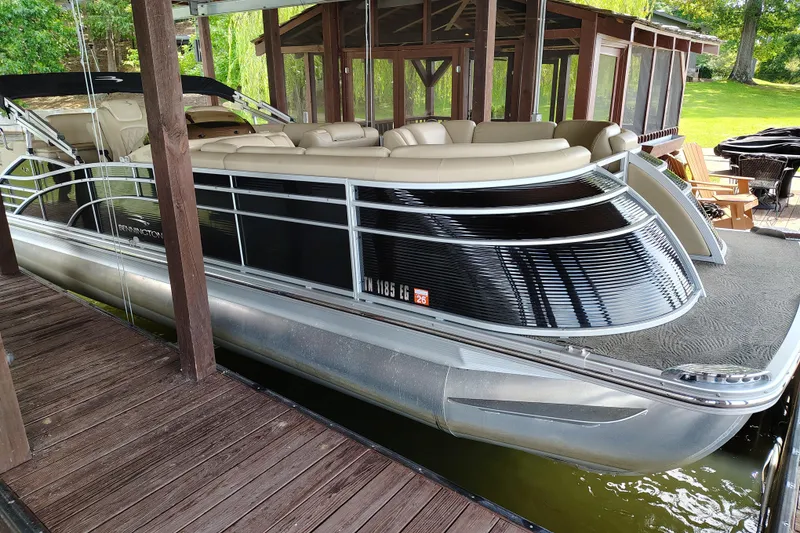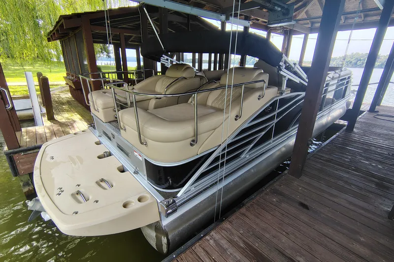 Introducing the 2014 Bennington 2575 QCW I/O, a stunning all freshwater used boat that combines style and performance. With an overall length of 27.5 feet, this aluminum tri-toon beauty is designed for comfort on the water, but don't let her elegant appearance fool you, this Q25 is powered by a robust 430hp Mercruiser 8.2L MAG H.O. Bravo III X inboard/outboard engine promising exhilarating rides and with only 104 hours of use, ensures reliability and power for your aquatic adventures. The raised helm platform and premium console features dark woodgrain accents, custom gauges, captains choice exhaust, an electric engine hatch lift, mood lights, a Garmin depth finder and a Sony stereo system. The boat is filled with luxury pillow top seating including pure-comfort recliners, arm rests with cup holders, a cocktail table and two deluxe rear facing loungers. This boat features a sleek design including a swim platform and a bimini top, perfect for leisurely cruising or entertaining guests. Its spacious layout provides ample room for relaxation and enjoyment, making it an ideal choice for family outings or gatherings with friends. Boat comes with a full cockpit cover.