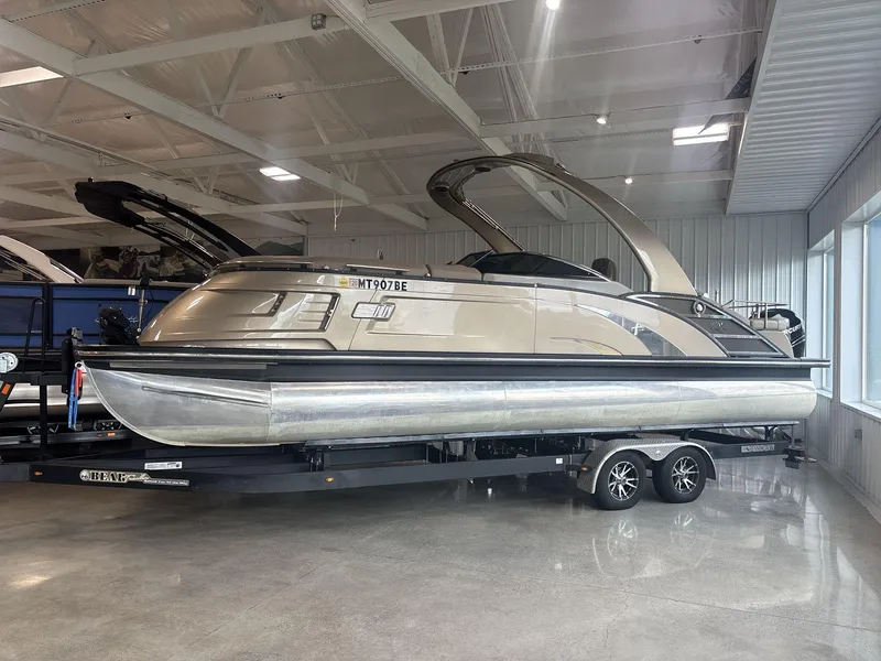 , This 2022 Bennington 25QXSBWA is powered by a Mercury 400hp outboard and built on Bennington's Sport Performance System (SPS) hull for confident handling and a smooth ride. The layout features a convertible swingback lounge with walk-around access, a sleek fiberglass helm, and premium upholstery throughout. RGB lighting, a power Bimini, and stainless accents add modern touches. A well-equipped option for those seeking space, performance, and upscale comfort on the water.