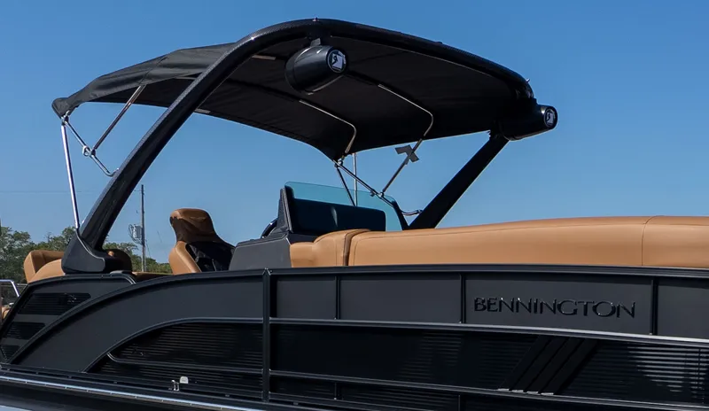 Exterior - 6 Inch Stainless Steel Cleats. Extended Aft Deck Full Length Extruded Anodized Skirting Heavy Duty Rub Rail. Quick Release 10 Foot Bimini Top With Surlast Embroidered Boot, 1.25 Inch Frame And Trailering Struts Surlast Mooring Cover Underdeck Spray Deflectors Mooring Cover Quick Clips Extruded Splash Guards Rounded Solid Keels Lillipad Ladder Raised Bennington Logos New Dock Speed Exterior With Signature Bow Sweep, Signature Aft Rail, Bow Louvers Stainless Steel Aft Rail With Dual Stern Gates.