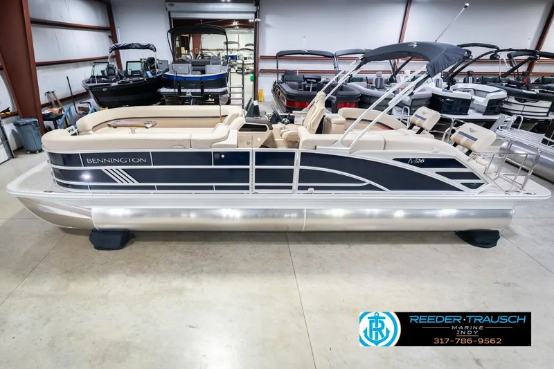 Introducing the new 2026 Bennington 26 MSL, a top-tier tritoon designed for performance and comfort on the water. Measuring 26 feet in length with a beam of 8'6", this boat is built for spaciousness and stability. The midnight blue aluminum hull and modern aesthetics are both stylish and durable.Powered by a 250-horsepower Mercury outboard engine, the Bennington 26 MSL ensures a robust and efficient ride, suitable for both leisurely cruises and more dynamic outings. The added luxury of RGB lighting and an electric bimini enhances the onboard experience, providing convenience and ambiance at the push of a button. This model runs on gasoline and is currently available for purchase, making it a prime choice for boat enthusiasts looking for a new, state-of-the-art vessel. With its high-quality craftsmanship and advanced features, the 26 MSL offers a balance of performance, luxury, and reliability.