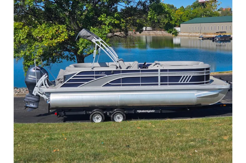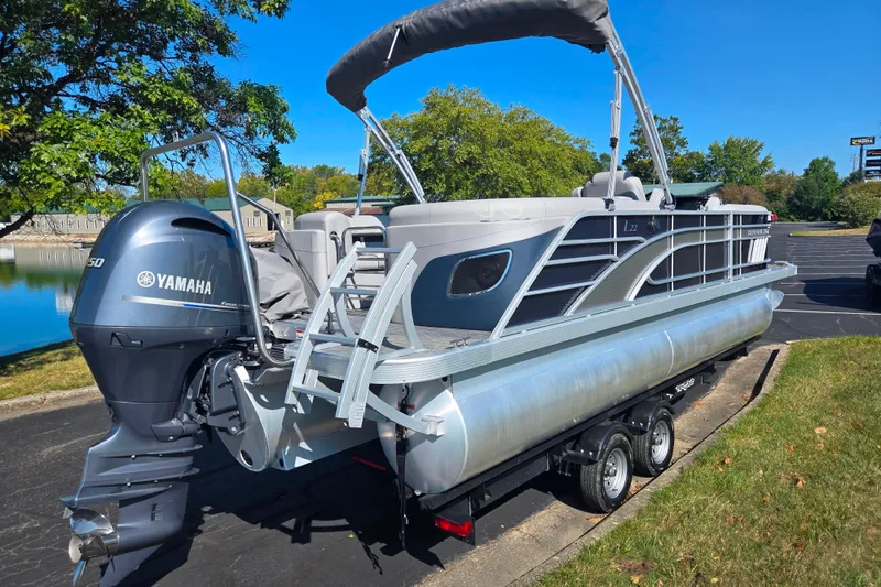Very Nice 2022 Bennington 22 LFBC Tri-Toon comes with: 150 h.p. Yamaha XB with ONLY 23 Hours, Custom Cover, Bimini Top, Ski/Tow Bar, swim deck w/ ladder, Digital Display, Custom Trailer, and more.