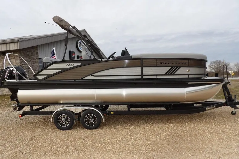 2026 Bennington 22 ML powered by a Mercury 150 hp 4-stroke motor. This boat includes numerous features and options including: Metallic Silver and Metallic Sorrel Exterior Color Combo, Blackout Luxe Package, SPS Tri-Toon Performance Package, Rough Water Package, Lifting Strakes, 34 Gallon Fuel Tank, Hydraulic Steering with Tilt, Full Underdeck Shielding, Black Rub Rail Insert, Battery Switch, Extended Aft Deck with the Lilli-Pad Ladder, In-Floor Storage, 7" Vivid Screen (Glass Dash), American Flag Kit, Chaise Convenience Table (includes trash can, built in table, and a dog food and water bowl), Shoreline Grey Flooring, Reclining Helm Seat, Windshield, Wireless Phone Charger, Rockford Fosgate Stereo with USB/ MP3 Port, Bluetooth Ready, 4 Rockford Fosgate Speakers, Console Glovebox, Docking Lights, Ski Tow Bar, Mooring Cover, Removable Table, 10' Curved Bimini Top w/ LED Lighting, LED lighted Gate Glides for the bow gate, aft gate, and the port side gate, Mercury SS Prop, and an Interstate starting battery.