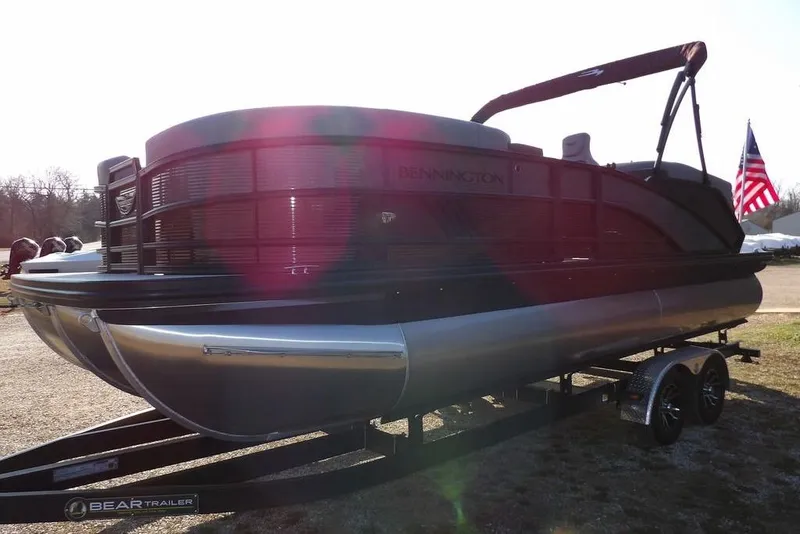 2026 Bennington 22 MFB powered by a Mercury 150 hp 4-stroke motor. This boat includes numerous features and options including: Sunset Red and Anthracite Exterior Color Combo, Blackout Luxe Package, SPS Tri-Toon Performance Package, Rough Water Package, Lifting Strakes, 34 Gallon Fuel Tank, Hydraulic Steering with Tilt, Full Underdeck Shielding, Black Rub Rail Insert, Battery Switch, Extended Aft Deck with the Lilli-Pad Ladder, In-Floor Storage, 7" Vivid Screen (Glass Dash), American Flag Kit, Chaise Convenience Table (includes trash can, built in table, and a dog food and water bowl), Shoreline Grey Flooring, Reclining Helm Seat, Windshield, Wireless Phone Charger, Rockford Fosgate Stereo with USB/ MP3 Port, Bluetooth Ready, 4 Rockford Fosgate Speakers, Console Glovebox, Docking Lights, Ski Tow Bar, Mooring Cover, Removable Table, 10' Curved Bimini Top w/ LED Lighting, LED lighted Gate Glides for the bow gate, aft gate, and the port side gate, Mercury SS Prop, and an Interstate starting battery.