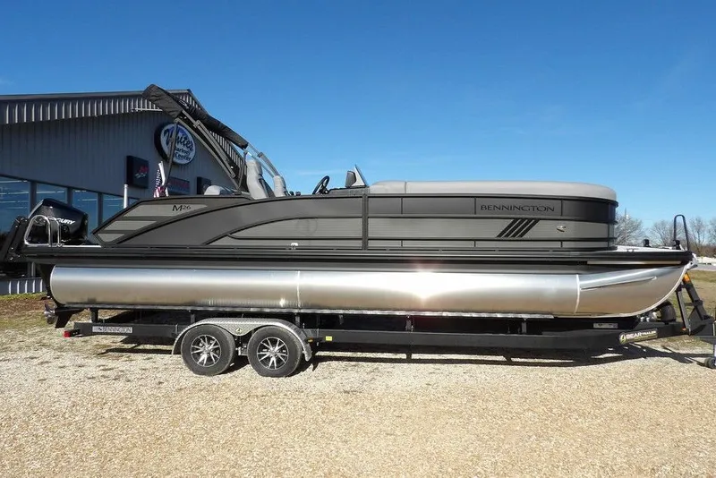 2026 Bennington 26 MSB powered by a Mercury 250 hp V8 4-stroke motor. This boat includes numerous features and options including: Anthracite and Matte Black Exterior Color Combo, Blackout Luxe Package, ESP Tri-Toon Performance Package, Lifting Strakes, 73 Gallon Fuel Tank, Mercury Power Steering with Tilt, Full Underdeck Shielding, Black Rub Rail Insert, Dual Battery Switch, Extended Aft Deck with the Lilli-Pad Ladder, In-Floor Storage, 7" Vivid Screen (Glass Dash), American Flag Kit, Chaise Convenience Table (includes trash can, built in table, and a dog food and water bowl), Shoreline Grey Flooring, Reclining Helm and Co-Helm Seat, Windshield, Wireless Phone Charger, Rockford Fosgate Stereo with USB/ MP3 Port, Bluetooth Ready, 4 Rockford Fosgate Speakers, Console Glovebox, Docking Lights, Ski Pylon, Mooring Cover, Removable Table, 10' Curved Bimini Top w/ LED Lighting, LED lighted Gate Glides for the bow gate, aft gate, and the port side gate, Mercury SS Prop, and an Interstate starting battery.