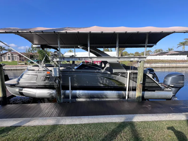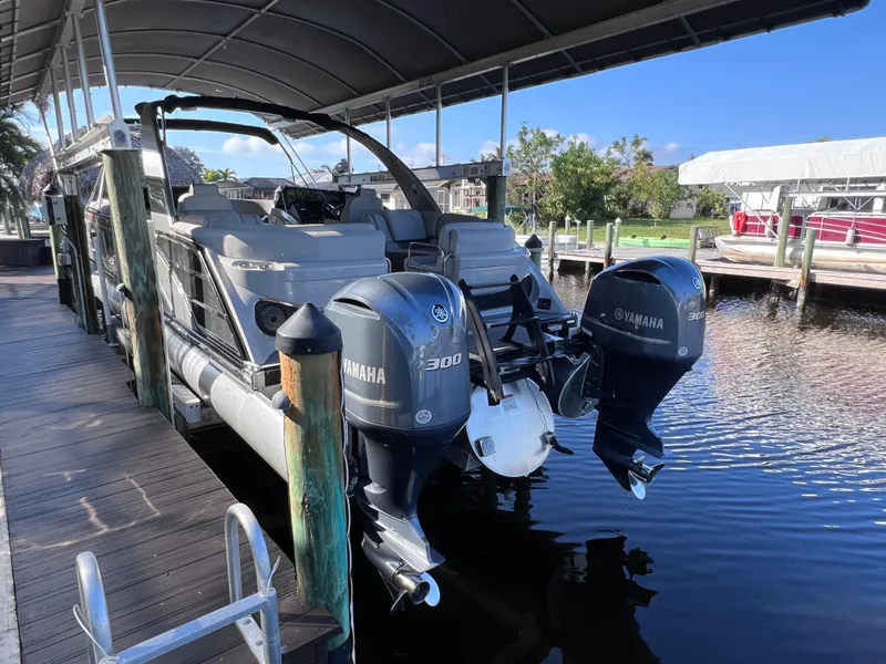 This Bennington 27 Q Series with the extra wide 10' beam, powered by a PAIR of Yamaha 300hp outboards is the perfect boat for either the intercoastal waterways, rivers or lakes. This pontoon boat packs a lot of punch for its size. This boat is lift-kept, under cover in Cape Coral Florida.