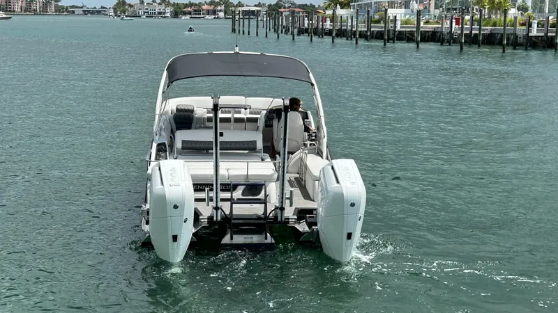 Twin Mercury 400s with joystick control. 800 horsepower of pure muscle plus point and click docking that makes you look like a pro every single time.