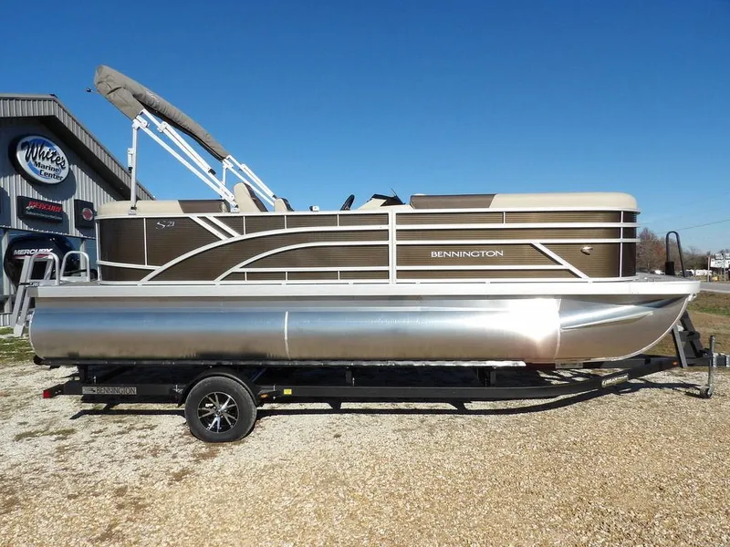 2025 Bennington 21 SSR powered by a Mercury 115 hp Command Thrust 4-stroke motor. This boat includes numerous features and options including: Bear Trailer, Gate Glide with built in LED lights for the bow gate, aft gate, and the port side gate, Wireless Phone Charger at the console, Windshield, built in Glovebox at the Console, Docking Lights, Phone Holder, Grano Platinum Vinyl Flooring, Reclining Helm Seat & Co-Helm Seat, Rockford Fosgate Stereo with USB/ MP3 Port, Bluetooth Ready, 4 Rockford Fosgate Speakers, Mooring Cover, Removable Table, 10' Bimini Top, 4 Step Rear Entry Ladder, Mercury Aluminum Prop, and Interstate battery.