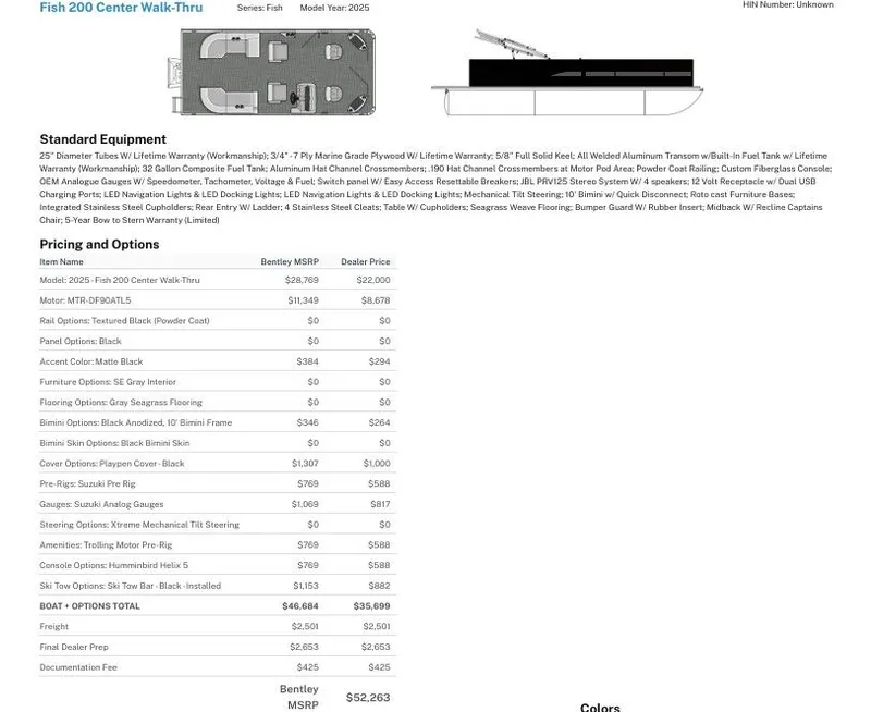 , Step aboard the 2026 Bentley 200 Center Walk Through (CWT), a versatile pontoon designed for families, anglers, and anyone who loves effortless time on the water. Powered by an industry-leading 90 HP Suzuki motor, backed by a standard 5-year warranty, this boat delivers reliable performance, smooth handling, and confidence on every ride. The CWT layout makes getting around easy, with a spacious center walk-through design that provides seamless access from bow to stern. Inside, you'll find plush seating, ample storage, and premium finishes that make every trip comfortable and stylish. Whether you're cruising the lake, anchoring for a fishing session, or entertaining friends and family, the 200 CWT balances performance, practicality, and Bentley's signature craftsmanship. With its efficient Suzuki engine, thoughtful design, and durable build, the 2026 Bentley 200 Center Walk Through is ready to elevate your boating adventures while giving you peace of mind on the water.
