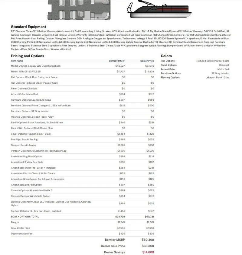 Use our boat payment calculator to estimate monthly payments for 2027 Bentley Pontoons 223 LEGACY QSB. Enter your down payment, choose a loan term, and adjust the interest rate to see an instant payment estimate — ideal if you're calculating boat payments before you enquire. Wondering how much does a Pontoon cost in today's market, or how much does a Bentley Pontoons cost for similar models? This boat financing calculator helps you compare scenarios in seconds, whether you're considering used boat financing or a new purchase.