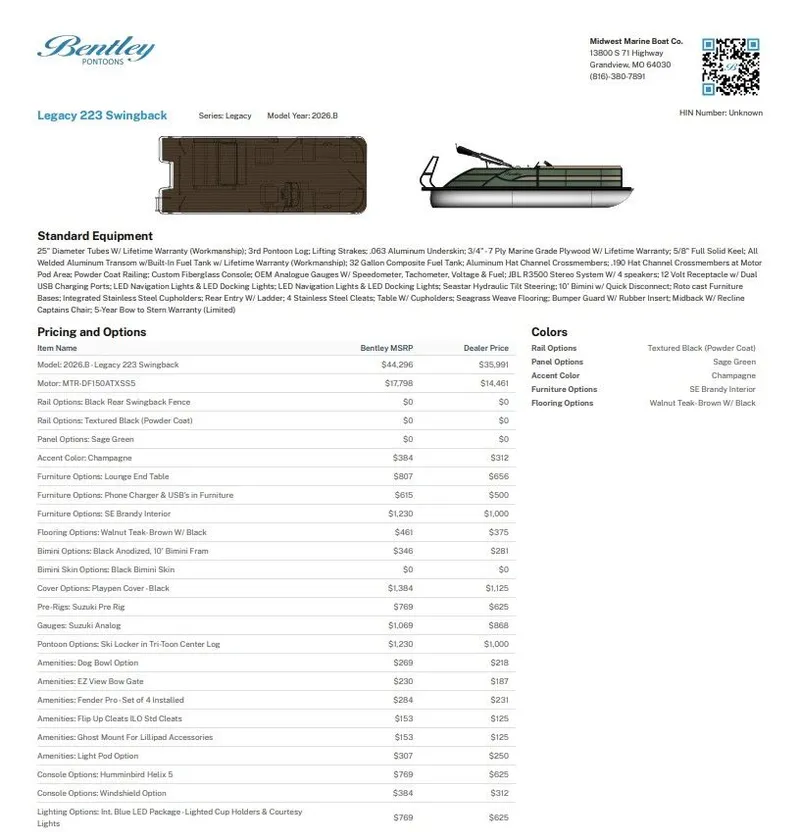 2026 Bentley Pontoons 223 Legacy Swingback