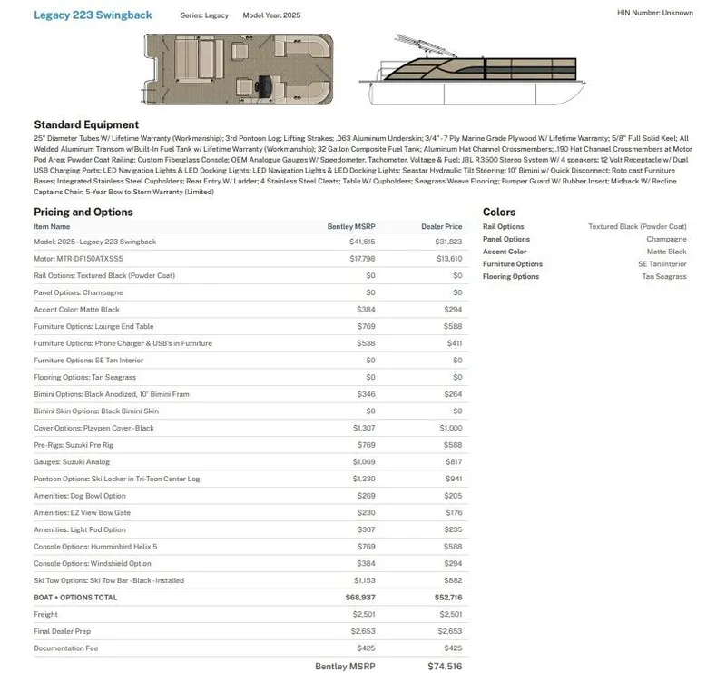, Step into luxury and performance with the 2026 Bentley 223 Legacy Swingback, a stunning pontoon designed to deliver comfort, style, and reliability on every ride. Powered by an industry-leading Suzuki 150 HP engine, this model offers smooth, efficient power and peace of mind backed by a standard 5-year warranty. The 223 Legacy Swingback features Bentley's signature craftsmanship, with plush seating, a versatile swingback lounger, and premium finishes throughout. Whether you're entertaining friends, cruising at sunset, or enjoying a quiet day on the lake, this pontoon provides an exceptional experience for everyone onboard. Its performance toons ensure a stable, confident ride, while modern design touches and thoughtful details make it as beautiful as it is functional. The 2026 Bentley 223 Legacy Swingback is more than a boat-it's your ticket to a refined, worry-free time on the water.