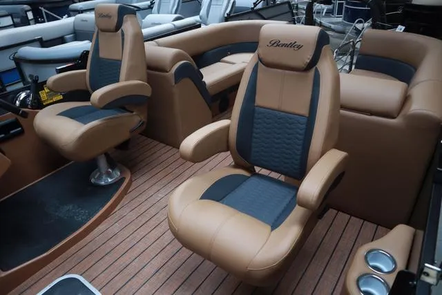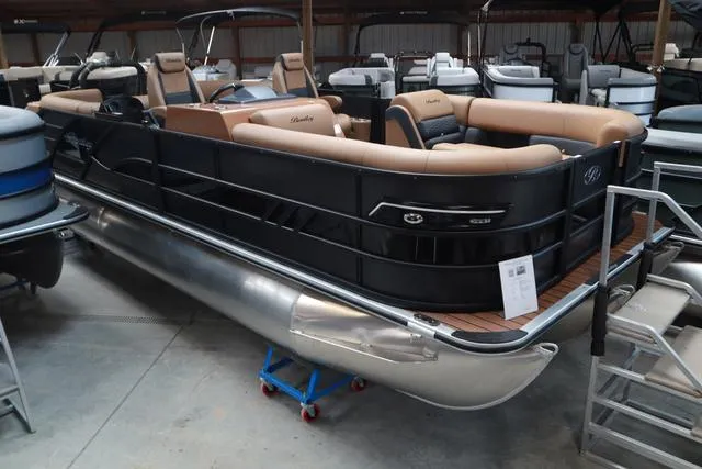2025 Bentley Pontoons Elite 223 Admiral Triple Tube Pkg, Price Includes a Mercury 200XL, Stainless Steel Prop, Tandem Axle Trailer with Brakes, Power Assist Steering with Tilt wheel, Upgraded Full length Center Log, In Floor Ski Locker Storage, Walnut Teak - Brown w/ Black Accent Flooring, Rockford Stereo System Upgrade w/ 6 speakers and amp, Rear Radio Remote, 12Volt Receptacle w/ Dual USB Charging Ports, Raised Helm Platform, Custom Fiberglass console with windshield, and Elite Mercury- W/ Gateway & Twin Simrads, Phone Charger & USB's in Furniture, Exterior Blue LED Package (Rear Underwater Lights & Underdeck Lights), Interior Blue LED Package (Cupholders & Courtesy), LED Docking Lights and LED Navigation Lights, Stainless Steel Flip Up Cleats, Battery Cut off Switch with one battery, Upgraded Power 10' Bimini Top with Quick Disconnects, Lounge End Table, Roto cast Furniture bases with Premium Furniture W/ Upholstered Bases Tan soft touch vinyl Interior and and integrated SS Cupholders, Table and base, High Back Captain's and Co-Captain's chairs, Ski Tow Bar, Lillipad Ladder, and Black Playpen Cover. Color is Matte Black Panel with Black Accents, Textured Black (Powder Coat) Rails, BLACK GRAPHICS, NEW Brandy Interior and Walnut Teak - Brown w/ Black Accent Flooring. Price includes dealer prep and freight.