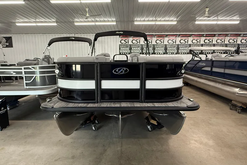 This is a 2026 Bentley Legacy 243 Navigator Triple Log Pontoon that is powered by a Mercury 200 XL 4 Stroke with Stainless Steel Prop. This boat is Black in color with White Accents with SE Grey Interior and Grey Seagrass Full Vinyl Flooring. We have our stock boat equipped with the following options: Full Length Center Log Upgrade with Hydraulic Steering & 54 Gallon Fuel Tank, Blackout Package (Black Rails, Black Bimini Frame, Black Deck Trim & Black Rubrail), Bow Light Pod Upgrade, Flip Up Cleats at Bow & Stern, In Floor Ski Storage, Ski Tow Bar, Mercury Gauges, Helix 5 GPS/Depth Finder, and Playpen Cover.