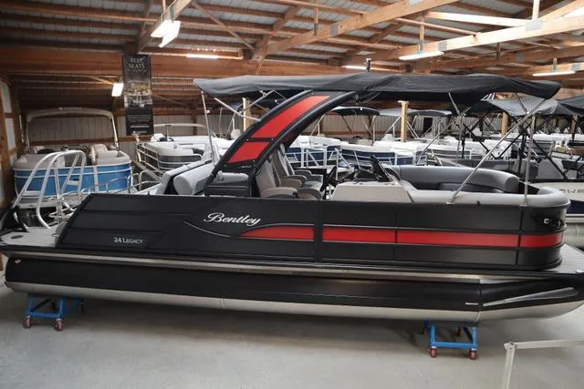 2025 Bentley Pontoons Legacy 243 Swingback Ext. Triple Tube Pkg, Price Includes a Mercury 250XL DTS (Built in 2023), Stainless Steel Prop, Tandem Axle Trailer with Brakes, Power Assist Steering with Tilt wheel, Mercury Digital Fly-By-Wire rigging, Upgraded Full length Center Log with 54 Gal Gas Tank, HD Splash Fins, Ski Locker In Floor Storage, Upgraded Slate Teak- Gray W/ Black Flooring, Wake Tower w/ Wet Sounds Audio Pkg. & Rear Bimini Ext., Opt. Forward Bimini Extension, 12Volt Receptacle w/ Dual USB Charging Ports, Custom Fiberglass console with Raised Helm, windshield, OEM Digital Gauges (Multi Gauges), Simrad NSX 7 (GPS & Depth Functions Only), Interior Blue LED Light Pkg (Lighted Cup Holders & Courtesy Lights) & Exterior Blue LED Pkg (Underdeck and swim lights), Light Pod Option (LED Docking Lights and LED Navigation Lights), S.S. Rail Mounted Flag Holder w/ Flag, Flip Up Cleats, Battery Cut off switch with one battery, Lounge End Table, Roto cast Furniture bases with SE Gray soft touch vinyl Interior and integrated SS Cupholders, Upgraded High Back Captain's and Co-Captain's chairs, Ski Tow Bar, Bentley Premium Radius Wide-Step Aluminum Black Ladder and Black Playpen Cover. Color is Matte Black Panel with Matte Red Accent, Textured Black (Powder Coat) Rails, Gray Interior and Gray Slate Teak Flooring. Price includes dealer prep and freight.
