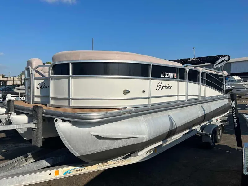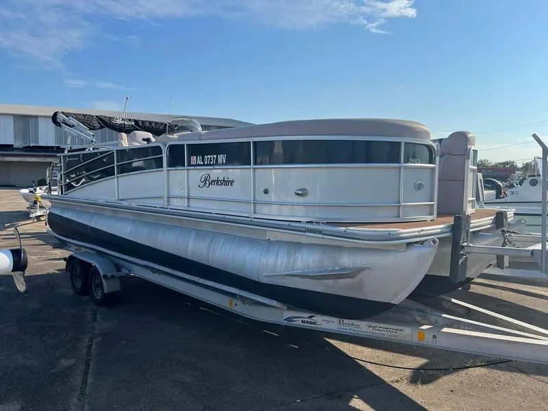 , This 2015 Berkshire 23 foot cruise model is being offered for sale with the trailer shown. This boat is not being sold with an engine. It is equipped with the tritoon 2.75 performance package with teak floor upgrade. It only has removable cockpit table, stereo system and ski tow bar.504-737-2722