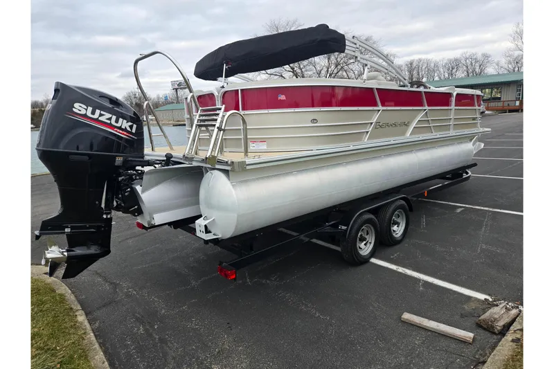 Nice 2020 Berkshire CTS 24RFX TriToon comes with: 150 horsepower Suzuki DF150 with Only 94 Hours, Ski/Tow Bar, Swim Deck w/ Ladder, 3 Blade SS Prop, Bimini Top, Cocktail Table, Tilt Wheel, Kicker Stereo/BT, Trailer, and more.