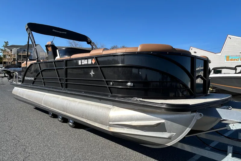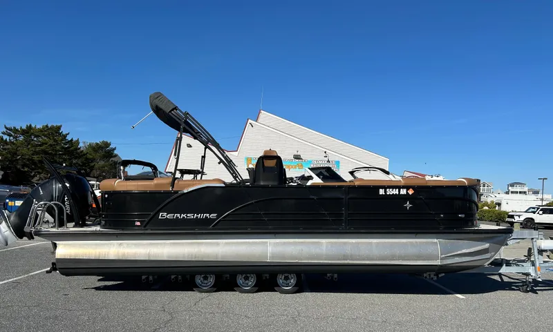 The 2021 Berkshire 25RFX DC STS 3.0+ is a 26-foot luxury pontoon boat known for its performance and comfort. It features a dual-console layout with spacious seating areas, including corner loungers at both the front and rear, and high-back captain and passenger chairs equipped with cool-touch upholstery. The boat is powered by a Mercury 400HP four-stroke Verado engine, offering ample power for cruising and watersports. Notable features include a Windshield , with an integrated Bimini top and stereo speakers, FULL touchscreen controls, and a full suite of electronic gauges