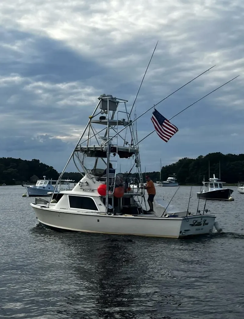 This 1975 classic was repowered with 2000 twin Yanmar 6LP-STE 300 hp engines each with just over 3200 hrs, has a Next Gen diesel generator recently rebuilt in 2022 with zero hours, an inverter, and has oversized stainless steel rudders. The flybridge with helmstation (& cover), tuna tower, deck mounted tuna chair, rod holders, extra spacious cockpit, and harpoon pulpit offer plenty of visibility, room, and storage, for the discerning angler. LITTLE EVA is equipped with a Ritchie compass, VHF,radar, Raytheon & North Star GPS's, Simrad APII autopilot, and Furuno depth/fish finder. Accommodations include a cuddy cabin with V-berth that sleeps 2, a Galley with a Nova Kool fridge, 2-burner electric cooktop, Heat/AC, interior/exterior lighting, and an electric head. She has been professionally maintained and has had several upgrades. LITTLE EVA will launch in June and will be ready to get you on the fish ASAP!