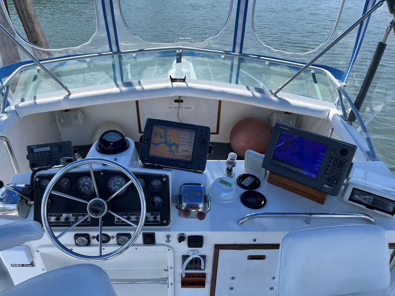 The Bertram 33 Sport Fisherman is a beauty that tames choppy seas. Even when the fish aren't biting, there isn't a more inviting place to spend a few days or even a few weeks. Catch the spacious, gracious, liveaboard accommodations for four. This exquisite interior includes a marvelous convertible dinette (with a slide-away berth), a giant galley and a fully equipped head with a stall shower. Plus, there's an elegant forward stateroom and plenty of storage. Above deck there are pedestal helm and companion seats, bench seating and outstanding visibility on the sort of flybridge normally found on a much larger boat (with a much larger price tag). And there's certainly enough room in her 116-square-foot cockpit for some serious fishing.
