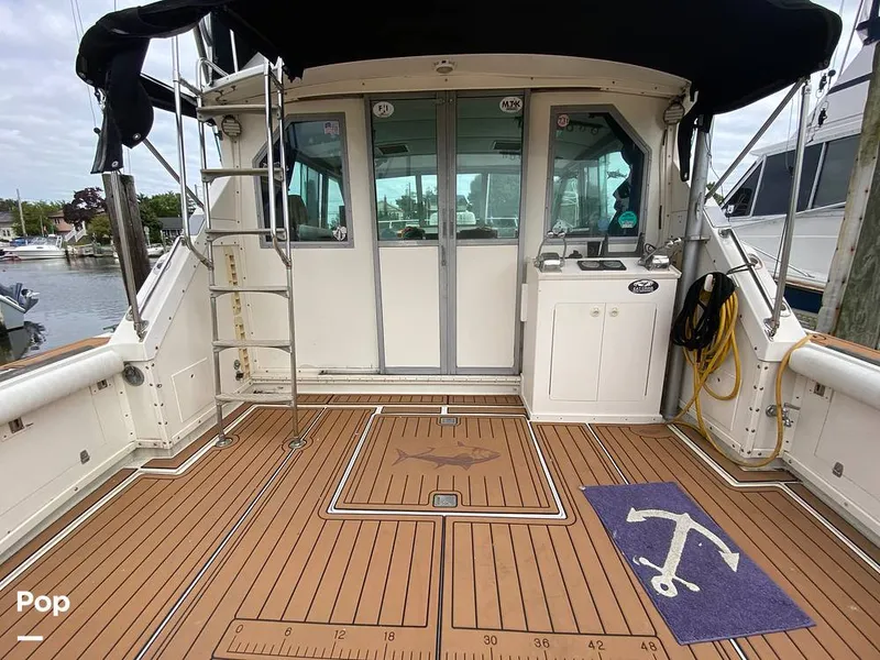 This boat show as well and pride of ownership is seen throughout. Recently installed foam decking on the cockpit really shows up nicely on this boat. The bridge is in great condition as well as the isinglass. This boat has been upgraded at some time in its history with a pair of 5.9 6BT Cummins diesel 375 HP motors with upgraded shafts and props and cruises at 22 knots.