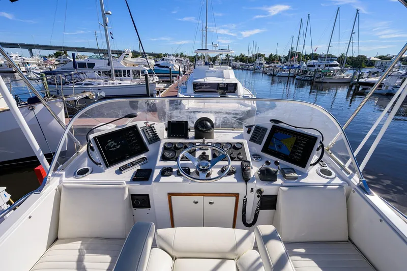 The wide walk around decks and the very large beam gives safe access to the foredeck. On the foredeck, you find new ground tackle and all-new stainless railings. The custom flag blue Awl-Grip and cloud flag white paint scheme give this boat a distinct and classy look and feel. For more information or to schedule a showing, please contact me today!
