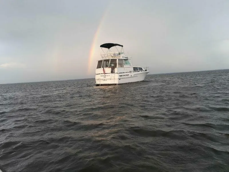Midnight Sun Too is a 1979 model that has undergone an interior refit throughout the years. Both cabins and the galley now have teak and holly soles with fitted carpeting in the salon. The dinette has been redone and the interior furniture consists of a three-piece sectional settee with a Stressless (brand) tan leather covered swivel recliner with ottoman. She is also equipped with a late model Onan 11.5 KW generator and four (4) reverse cycle marine air conditioners. The gelcoat is shiny indicating a well-cared for vessel.