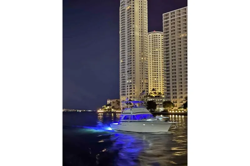 Large cockpit, flybridge, and traditional convertible layout with salon, galley, stateroom accommodations, and head. Ideal candidate for refit, repower, or customization.