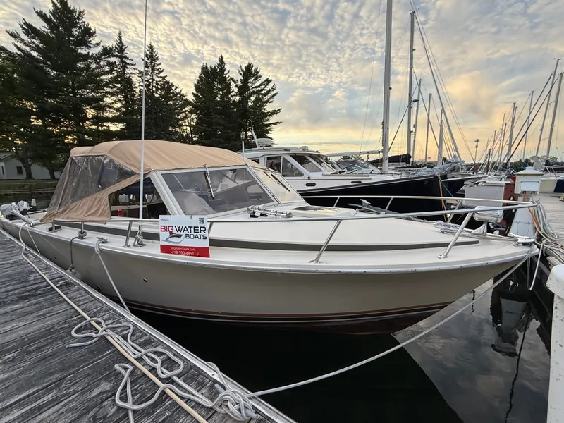 Open cockpit design with outboard enclosed storage lockers. Four deck hatches in fiberglass cockpit. Dual engines hatches with pass through going forward. To starboard is storage cabinet with DC refrigerator and drawer. The bench helm seat is forward and has a sink underneath accessed by folding the seat. Helm controls and electronics fwd. To port forward of the engine hatch is the collapsible dinette with bench seats fwd and aft. Storage drawer fwd. Bilge access hatches in deck. Louvered teak door open to the Vee berths with cushions and filler for a queen sized berth area. Under filler is a porta potti (that has a deck fitting for dockside discharge). Storage hanging lockers and overhead Deck hatch with screen. Forward is the rope locker access.
