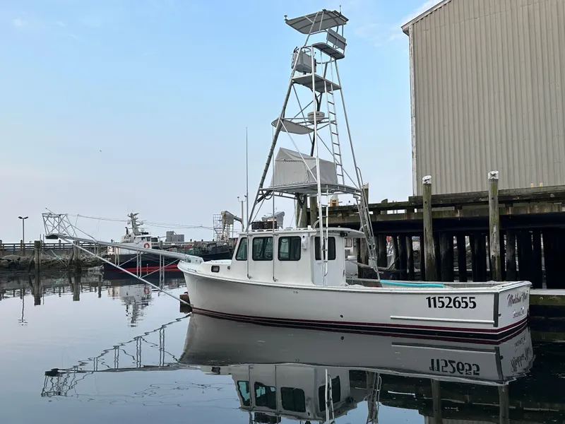 This commercial-finished 36 BHM / ATLANTIC Boat Company with a fly bridge and tower station is outfitted for harpooning Bluefin Tuna out of Perkins Cove, Ogunquit, Maine.