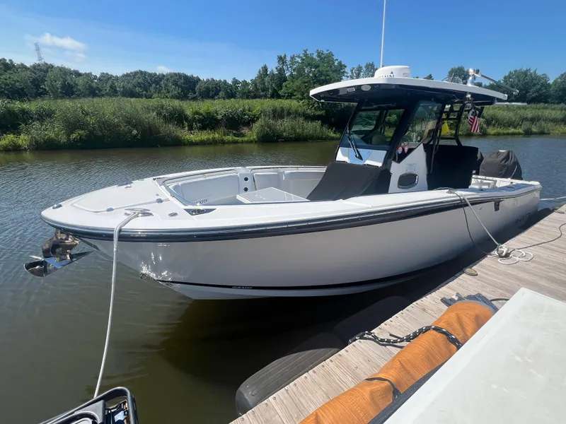 The boat also boasts a range of premium features, including a console cover, seat cover, bow bench seat cover, stainless anchor, stainless rub rail, windshield, bow table, SeaDek cockpit flooring, RTIC pull-out cooler, flip-down aft seating, dual helm seat, stainless wipers, bow sun shade, and aft sun shade. With all these amenities, you'll be cruising in style and comfort all day long.
