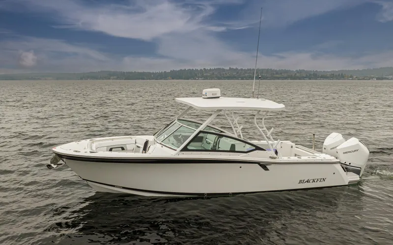Dual consoles have become one of the most popular styles of boats throughout the world, and with the return of Blackfin Boats, the Northwest Boater now has a boat that is not only of legendary performance but is built to the highest standards. Long regarded as one of the best fishing machines built, the new line of Blackfin boats combines a superior quality fishing machine with a cruising boat that the entire family can enjoy. The 272 DC is a true hybrid boat. With more standard features than anyone else, this special 272DC has so many additional options everyone wants including a joystick docking control system with Skyhook and Autopilot, White Engines, Full Canvas Enclosure for our NW Weather, Garmin 12" Screen with Radar, a day head with an electric toilet, an upgraded engine package with Digital Throttle System, seating for everyone, Yeti cooler, Hydraulic Seat for day boating that retracts for fishing, hard top, and so much more. This boat literally blows past the competition in every aspect.