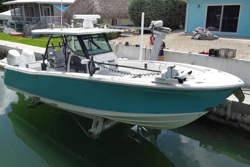 Winner of a Miami Innovation Award, the 332CC is proven innovational design at its best. Enjoy an abundance of perfectly designed fishing amenities like a tackle rigging station, insulated baitwells, and in-floor fish boxes as well as modern conveniences such as integrated storage, custom seating, dive/boarding door, telescoping, and recessed swim ladder, and full-size head compartment with Pantographic door. Meanwhile, captains will appreciate the leaning post with a custom helm seat, flip-up bolster, and command center.