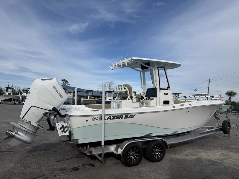 BRAND NEW 2026 BLAZER MAKAIRA 2600 WITH A MERCURY 400 V10 WITH MAGIC TILT CUSTOM TRAIKER GARMIN FORCE TROLLING MOTOR 5 BANK CHARGER JL UPGRADED STEREO FACTORY HARD TOP WITH D TUBE FRAME 10INCH HEAVY DUTY JACKPLATE FIBERGLASS SWIM PLATFORM BOW TABLE WITH CUSHION GARMIN 1243 IN DASH
