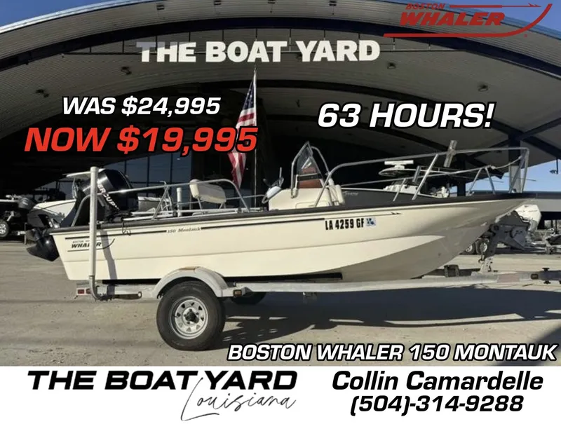 2007 Boston Whaler 150 MontaukMercury 90 (63 HOURS!)Single Axle Trailer***FINANCING AVAILABLE***Trade Ins AcceptedContact Collin for more info! (504) 314-9288SPECIFICATIONSLength: 15 feetBeam: 6'6'Hull Material: FiberglassMaximum Horsepower: 60 hpNet Weight (lbs): 950Maximum Engine Weight: 305 lbsFuel Type: GasTypical Usage: Saltwater fishing, day-cruising, freshwater fishingEngine: Outboard-4sDeadrise: 16 degreesDraft: 9 inches (0.23 m) Ready to hit the water? This 2007 Boston Whaler Montauk 150 is the perfect combination of legendary Whaler durability, compact size, and versatility – ideal for inshore fishing, cruising, or serving as a dependable tender.This Montauk 150 is a true turn-key boat – just launch and go. Whether you're chasing redfish in the marsh, cruising the bay with the family, or looking for a rugged and reliable utility boat, this Whaler gets it done.Boat Includes:Garmin GPSBimini TopUmbrellaIce Chest